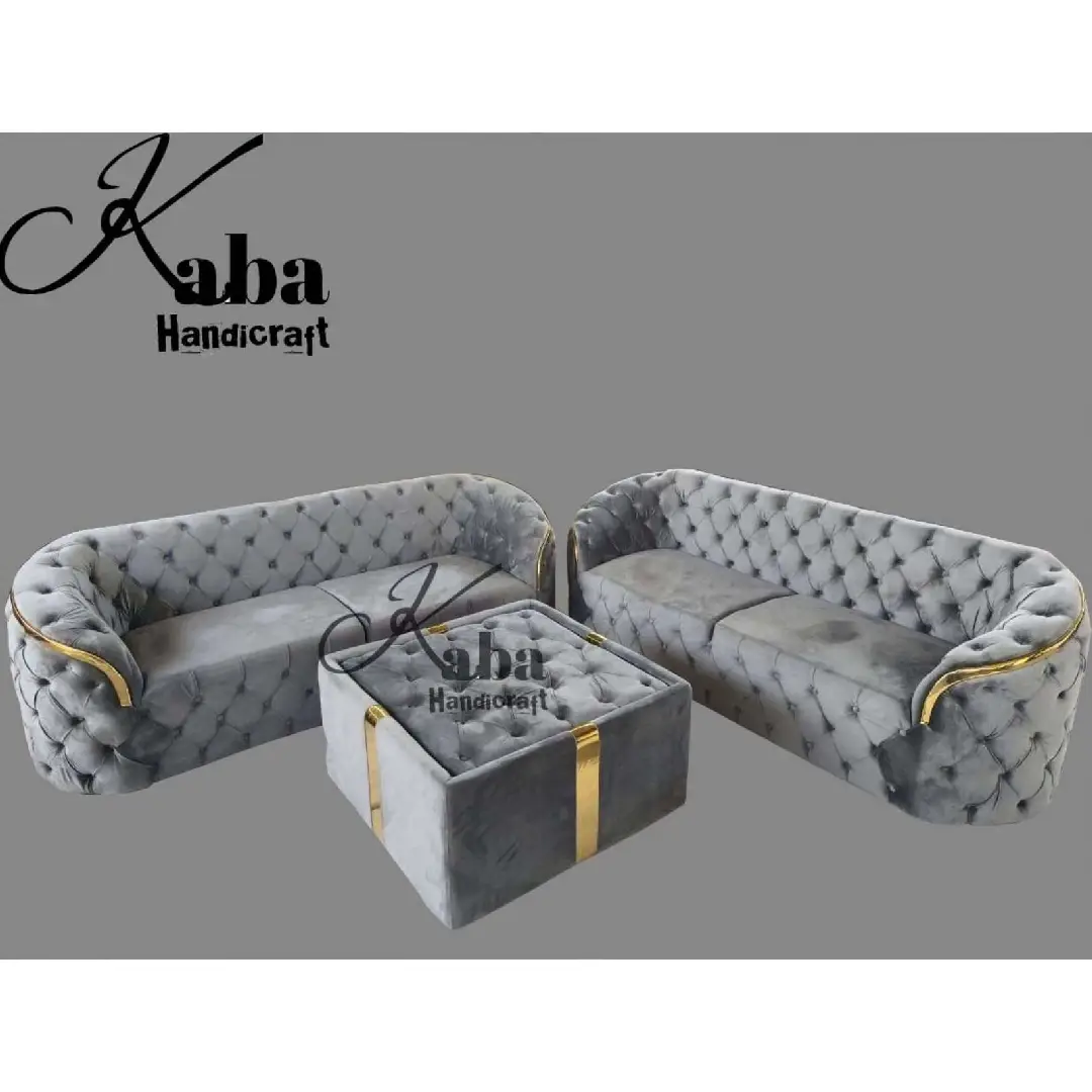 Timeless design meets luxurious craftsmanship in this sofa set from Kaba Handicraft. Featuring two gracefully curved sofas and a matching tufted ottoman, this ensemble blends traditional button tufting with rich grey velvet and bold gold detailing. The curved arms are accented with shimmering gold borders that elevate the silhouette, while the matching ottoman adds versatility and visual balance to the set.