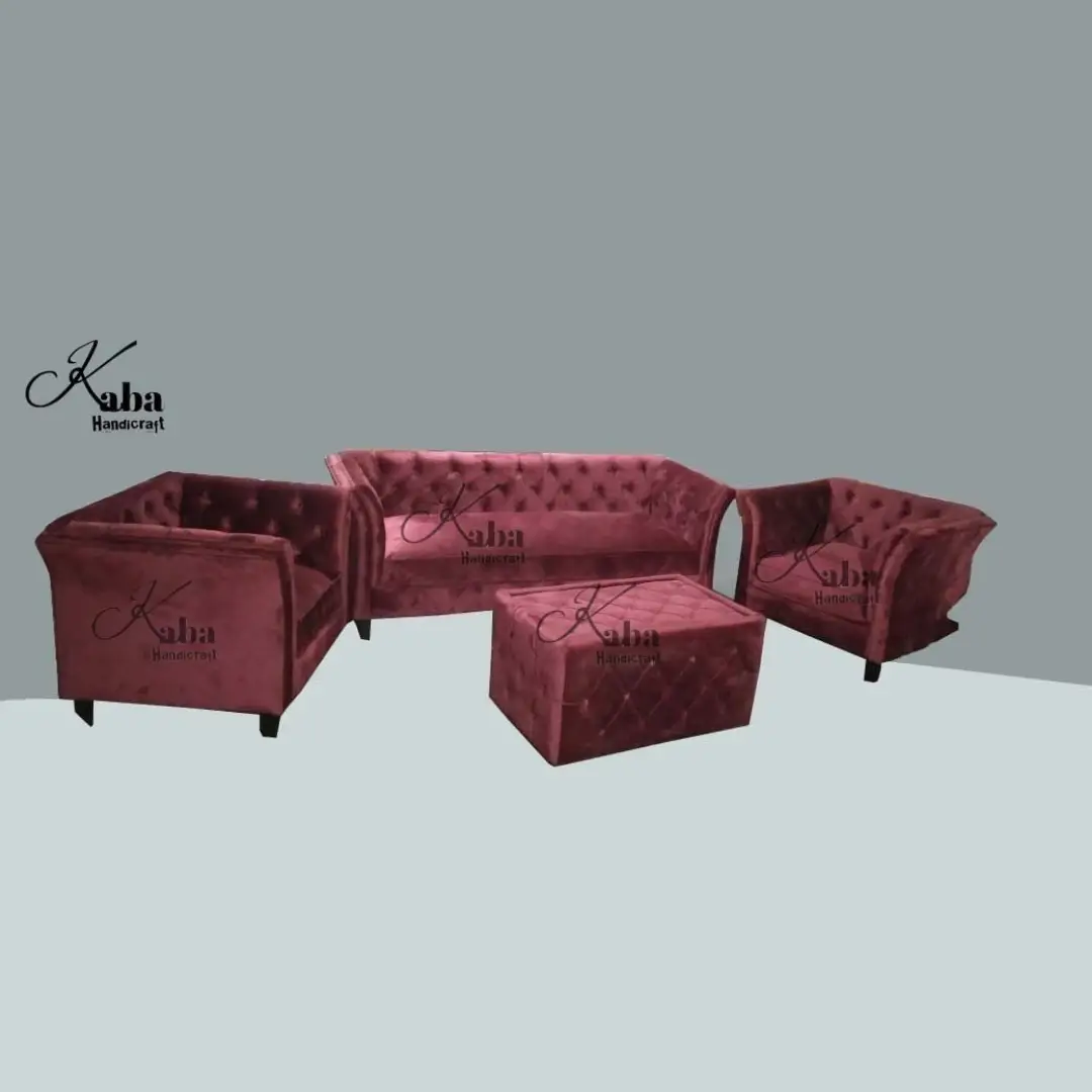 Add a regal charm to your living space with this handcrafted 5-Seater Velvet Sofa Set from Kaba Handicraft. Designed for luxury and comfort, this set includes a 3-seater sofa, two single armchairs, and a stylish ottoman/center table, all upholstered in rich velvet with deep button tufting for a timeless Chesterfield-inspired look.