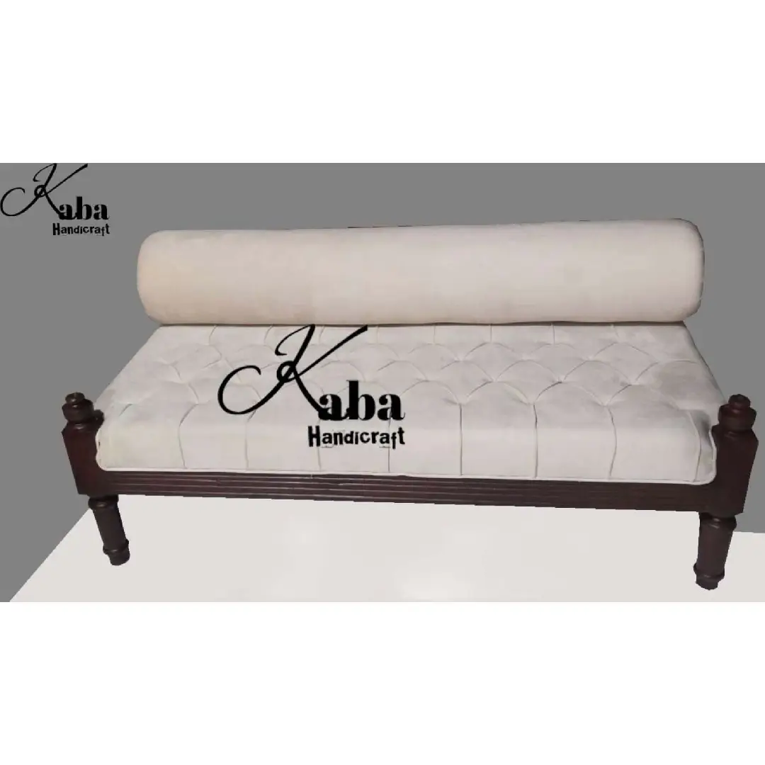 This handcrafted daybed from Kaba Handicraft brings together stately design and everyday ease. Upholstered in soft, light-toned fabric with deep diamond tufting, the cushioned top offers a plush surface for lounging or casual seating. A rounded bolster at one end complements the linear form, adding visual softness and usability.
