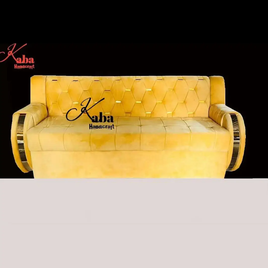 Bold geometry meets plush luxury in this handcrafted statement piece by Kaba Handicraft. Wrapped in radiant yellow velvet, the sofa features deep quilting in a diamond configuration, punctuated by rectangular accents that add rhythm and depth. The standout detail: metallic insets within each armrest that add architectural sharpness to its otherwise soft silhouette.